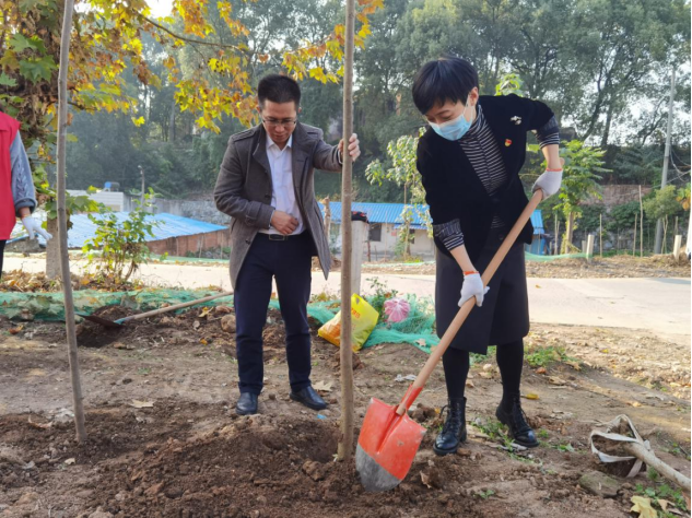 在夹弯路路边一块环境整治后的空地,党员干部分工合作开展植树,有的挥锹挖土,有的扶苗固定,有的填土踩实,干得热火朝天,经过两个多小时奋战,种下栾树100余棵,一棵棵树苗迎风耸立,生机勃勃,为镇平路社区增添一抹新绿。