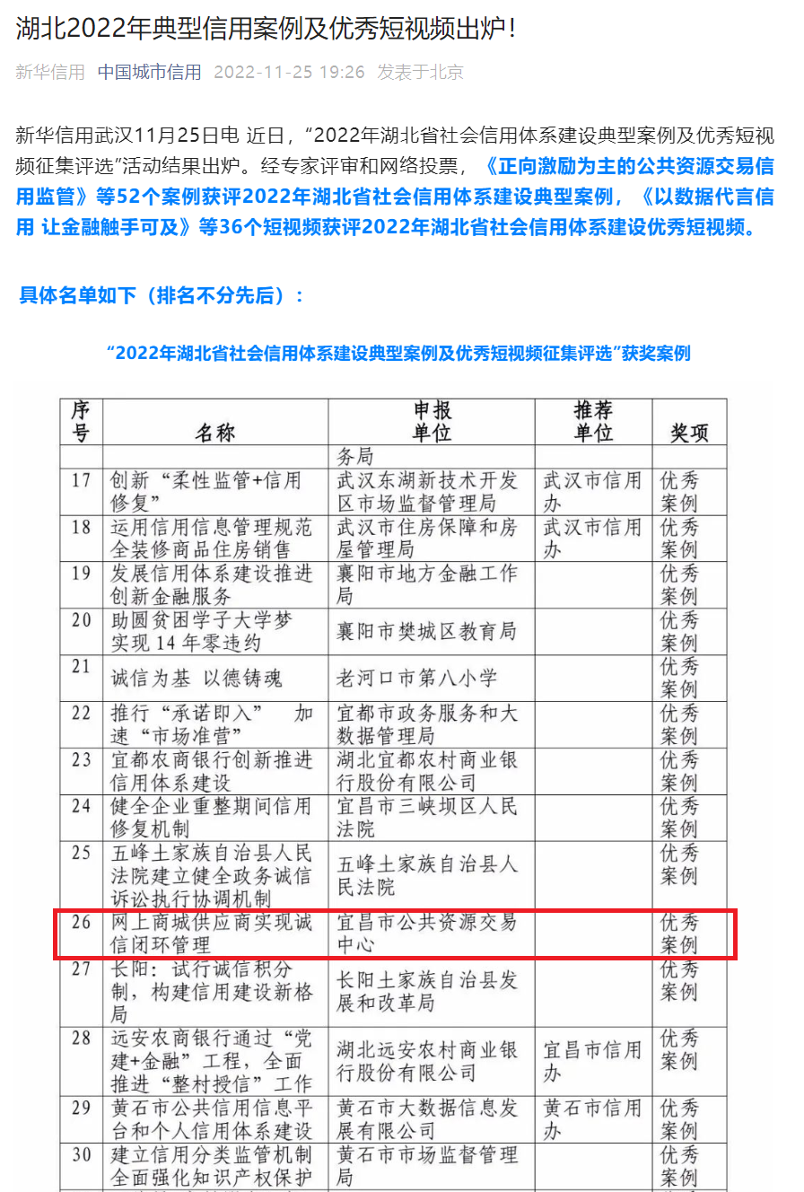 本网讯(通讯员 徐涛)近日,“2022年湖北省社会信用体系建设典型案例及优秀短视频征集评选”活动结果出炉。经网络投票和专家评审,宜昌市公共资源交易中心《网上商城供应商实现诚信闭环管理》案例入选2022年湖北省社会信用体系建设典型案例,这也是省内市(州)公共资源交易中心唯一获评案例。