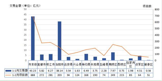(图为:宜昌市1-2月各县市区公共资源交易情况)