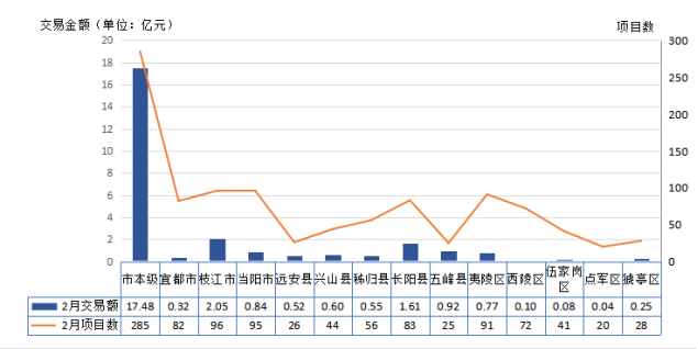 (图为:宜昌市2月各县市区公共资源交易情况)