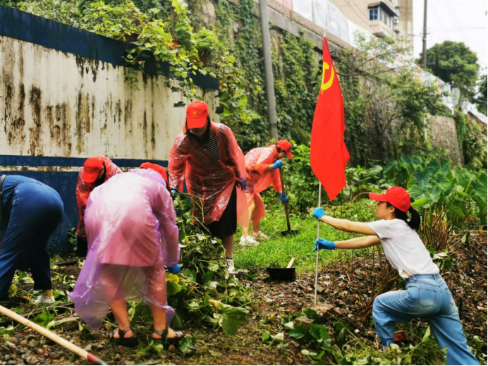 市公共资源交易中心冒雨清理社区防洪隐患点垃圾